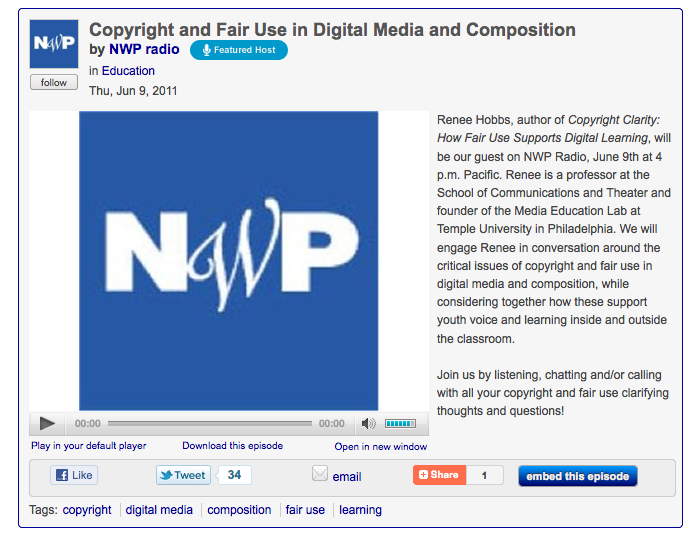 Listen to Renee Hobbs on Thursday, June 9 for a conversation about copyright and fair use on NWP Radio.