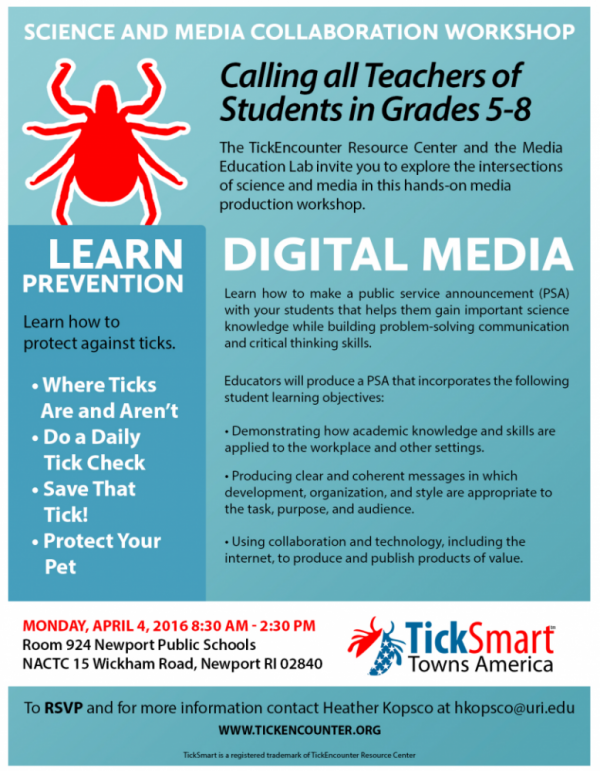 All are welcome to attend this free professional development workshop on Monday, April 4 from 8:30 am - 2:30 p.m. at the Newport Public Schools. Lunch by Chef Steven Kalble and the Newport Culinary Arts students is provided courtesy of the URI Tick Encounter Resource Center.