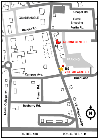 The Alumni Center is building #87 on the quick-reference map above. The Visitor Center is indicated with a star. Below is a link to the detailed map of the Kingston campus that references buildings both by name and numberÂ