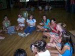 Although Camp Nockamixon does not have a computer lab, the team brought in a wireless laptop, projection screen, and speakers so girls could see My Pop Studio. A few girls were brought up in front of the group to play a game.